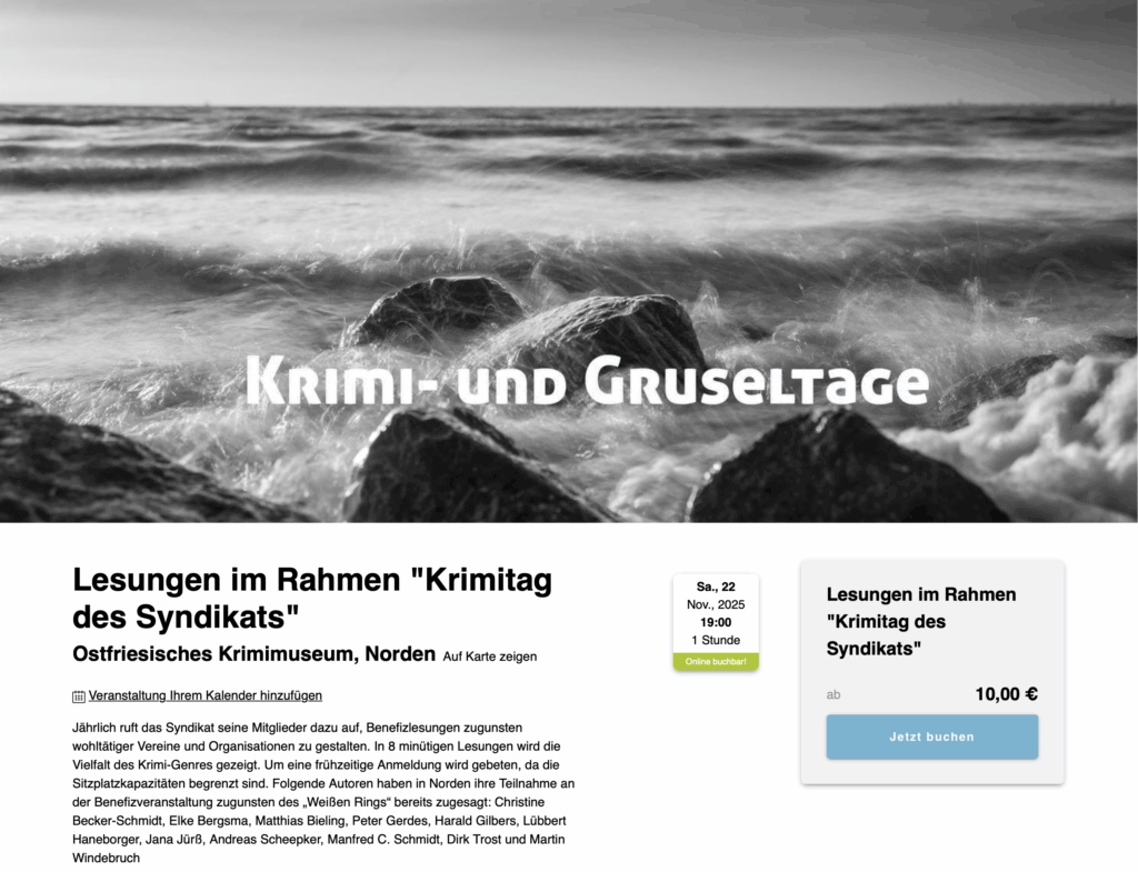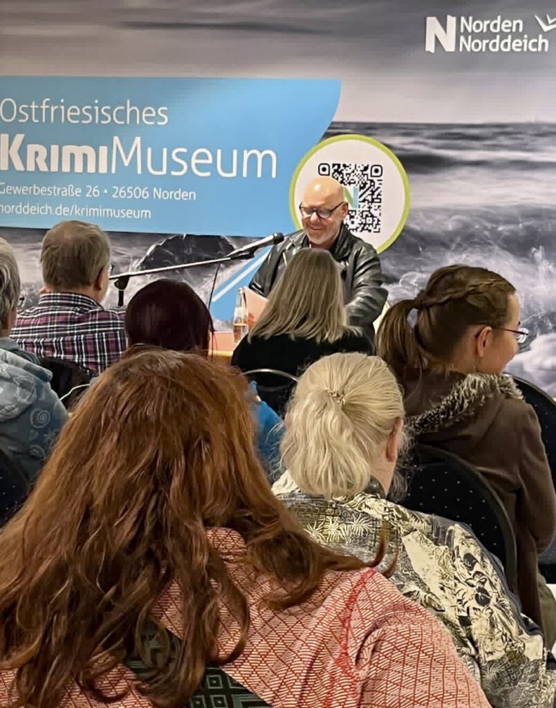 Am Samstagabend, dem 22. November 2025, fand im Ostfriesischen Krimimuseum die Abschlussveranstaltung der Norder Krimi- und Gruseltage statt. Wie Veranstaltungsleiterin Ilona Eilts zum Ende der Veranstaltung erzählte, hatten eine Woche lang 1000 Besucherinnen und Besucher 24 Veranstaltungen besucht: quasi ein Krimi-Adventskalender. Hinter dem gestrigen Türchen verbargen sich 11 Krimiautorinnen und -autoren des Autorennetzwerkes „Syndikat“, die im Rahmen des diesjährigen Krimitags in achtminütigen Quickies Spannendes aus ihren Werken lasen: Christine Becker-Schmid, Elke Bergsma, Matthias Bieling, Jana Jürss, Silke Arends, Peter Gerdes, Harald Gilbers, Lübbert Haneborg­er, Andreas Scheepker, Manfred C. Schmidt, Dirk Trost und Martin Windebruch. Es war mir eine Freude, Teil dieser Veranstaltung zu sein, ich habe an diesem Abend acht Minuten aus „Unterwelten“ mit Thyra König gelesen.